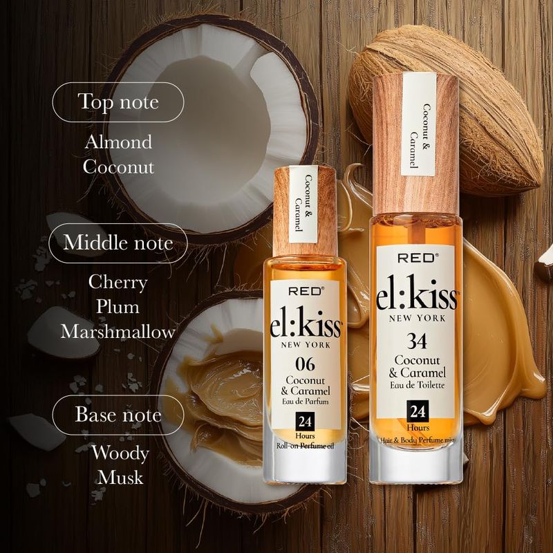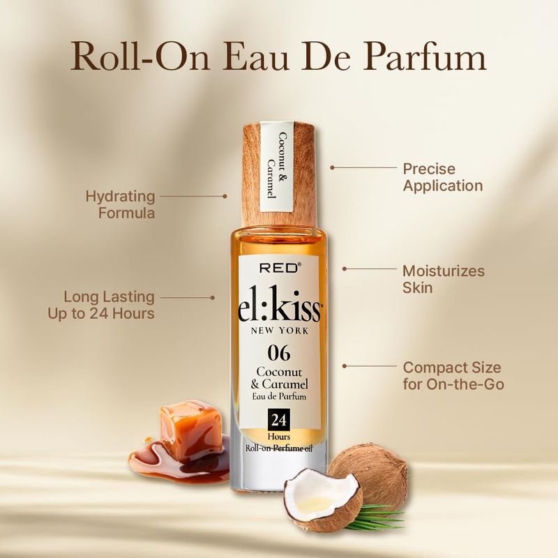 Eau de Parfum Roll On, coco y caramelo, 0.4 fl oz (.40 onzas líquidas), hidratante y de larga