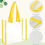 Material fiable: la bolsa de mano aprobada para estadios está hecha de material de PVC de calidad, que es firme y resistente, confiable en uso, ligero, suave e impermeable en la superficie, y no es fácil de deformar, decolorar o romper; las bolsas de regalo transparentes con asas son fáciles de transportar y levantar objetos pesados; la bolsa de compras de PVC es fácil de limpiar y se puede reutilizar