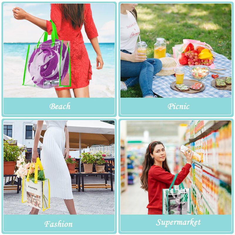 Amplias aplicaciones: la bolsa transparente transparente se aplica ampliamente en la vida diaria, como campamento en la playa, picnics, regalos de vinilo personalizados, bolsas de regalo de boda, conciertos, eventos deportivos, juegos, lotería de caridad, etc. ; Las bolsas transparentes grandes con asas pueden traer más diversión y comodidad a la vida
