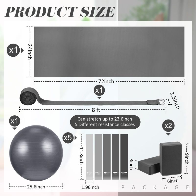 Bonito juego de yoga para principiantes: recibirás 1 pieza de esterilla de yoga de aproximadamente 72 x 24 x 0.24 pulgadas, 1 pelota de pilates de aproximadamente 25.6 pulgadas de diámetro, equipada con un tapón de gas, removedor de válvula, bomba de aire para inflar y usar fácilmente, 2 bloques de yoga en Acerca De 9 X 6 US x 3 pulgadas, 1 correa de yoga y 5 bandas de resistencia con diferente resistencia, un conjunto completo de equipo deportivo para principiantes y amantes del yoga