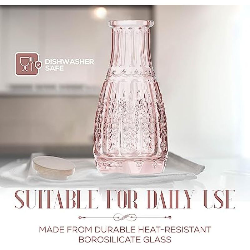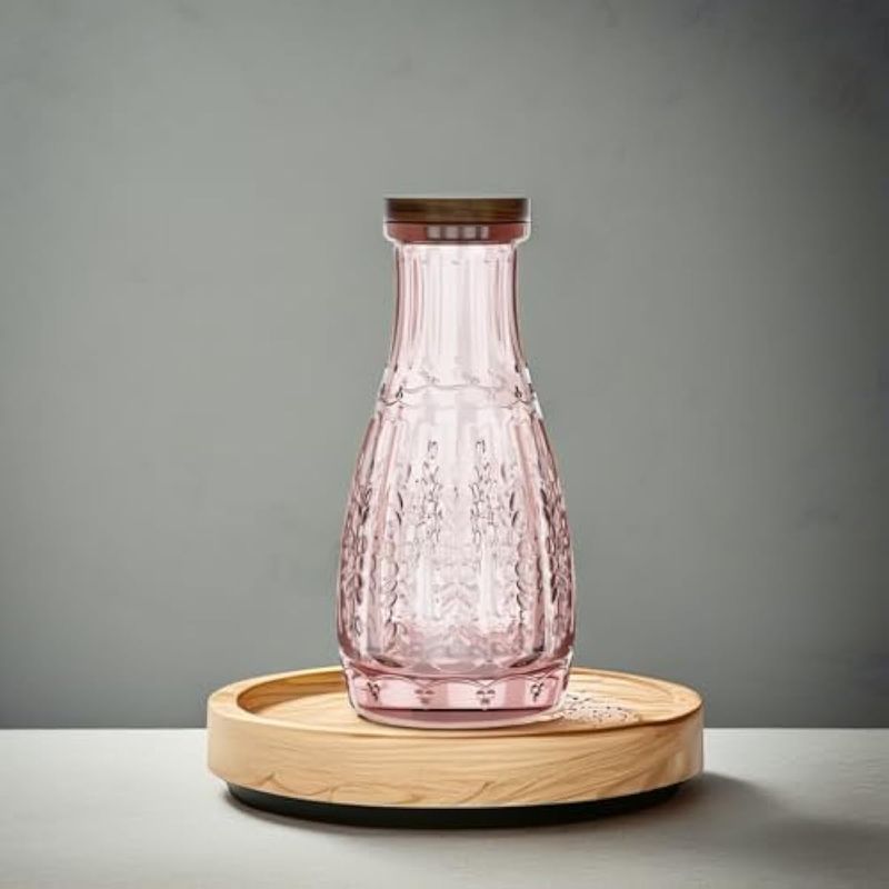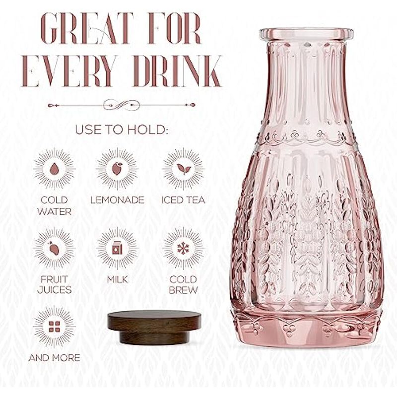 Aspecto sofisticado: diseño bellamente grabado en un decantador de vidrio de color rosa, la jarra elle decor creará un mayor interés visual y atractivo dondequiera que se muestre. La tapa de madera está hecha de silicona de grado alimenticio, lo que garantiza que es a prueba de fugas y derrames.