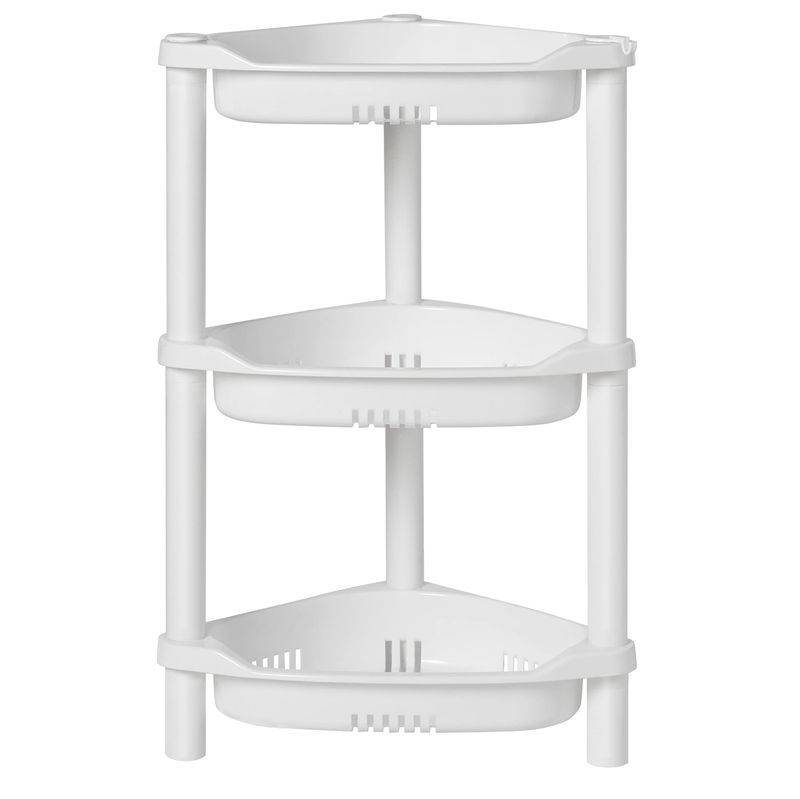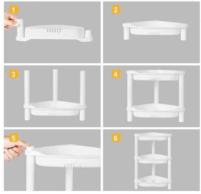 Plástico de alta calidad: el estante esquinero está hecho de plástico muy resistente y de gran calidad, resistente al óxido y al agua, tiene superficies planas para evitar que los artículos se resbalen del estante, mientras que los aleros también protegen las botellas de caídas en el baño o el suelo.