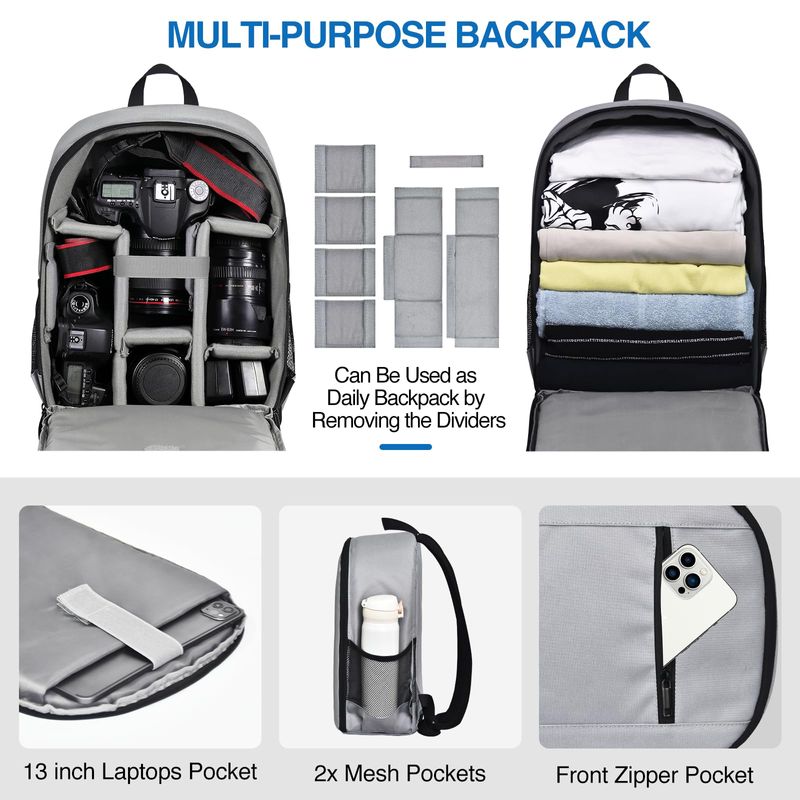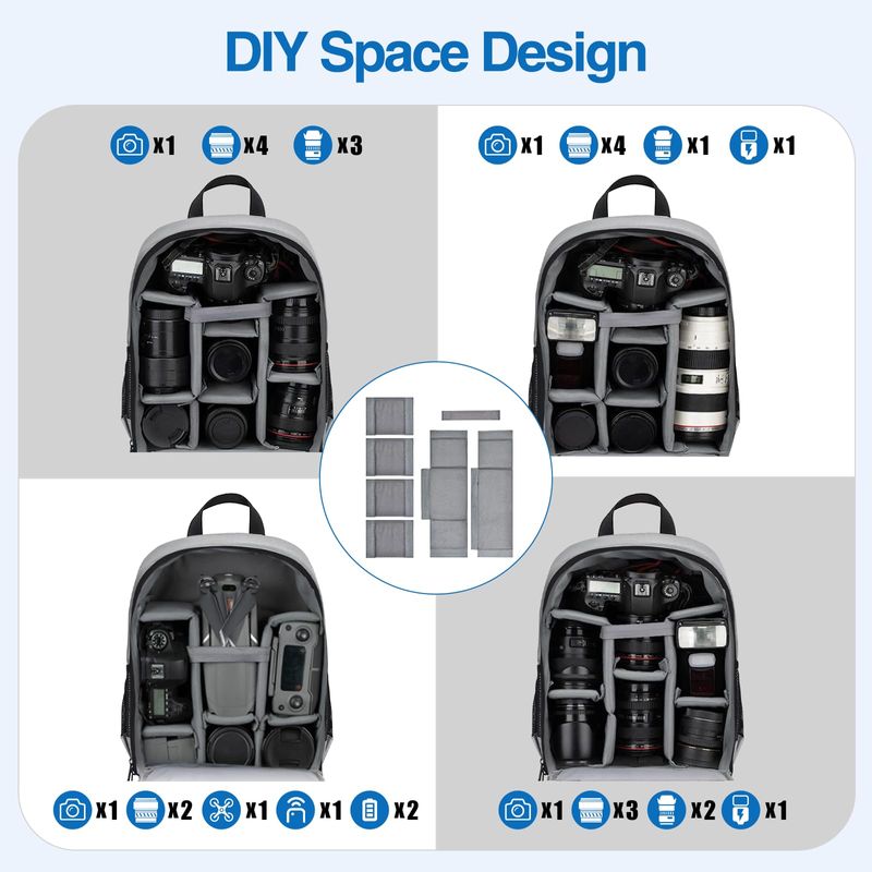 Diseño interior multifuncional: el interior está hecho de seis almohadillas de terciopelo desmontables de 0.55 pulgadas, a prueba de golpes y no se deforma. Cuando se saca parte de los separadores interiores, la mochila de cámara pronto se convierte en una bolsa casual diaria.