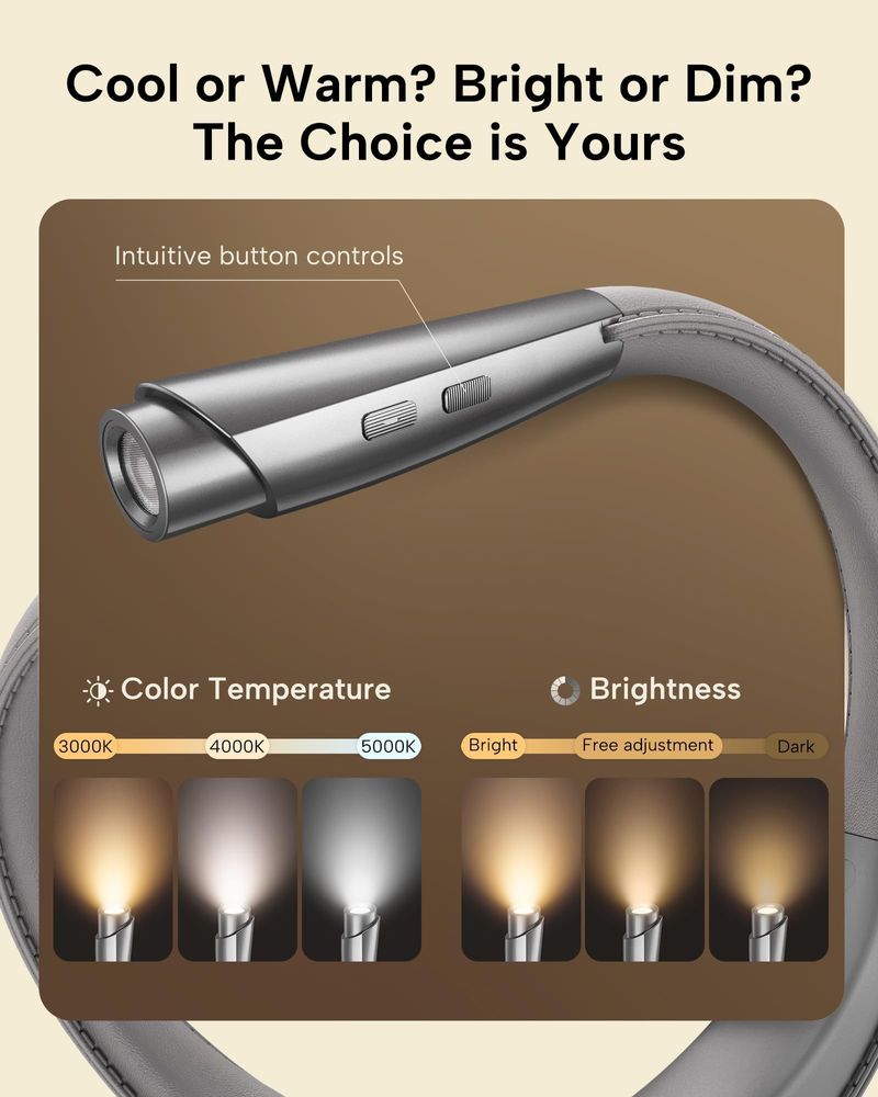 ?Multi Color Temperature?Our neck light offers three different color temperatures to choose from - white light, warm light, and warm white light. With just a short press of a button, you can easily switch between modes. The white light mode is suitable for tasks that require fine workmanship or nighttime activities, such as embroidery or running. The warm light mode is perfect for long hours of reading, with warm and soft lighting that makes you feel comfortable and relaxed