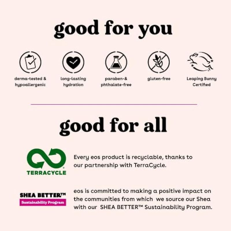 Manteca de karité totalmente natural: los productos para el cuidado de la piel eos tienen manteca de karité 100 natural de origen silvestre para hacer que la piel se sienta hidratada, protegida y suave; somos libres de parabenos, ftalatos y gluten, dermatológicamente probados, hipoalergénicos, certificados por Leaping Bunny, sin productos probados en animales