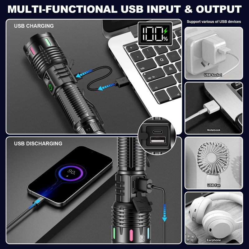 Carga y descarga USB C multifuncional 2 en 1: la linterna LED súper brillante de largo alcance está integrada en 2 interfaces USB, una es entrada USB C para cargar, la otra es salida USB para descargar, como puede cargar tu teléfono en caso de emergencias. Es compatible con varios dispositivos USB como teléfonos inteligentes, auriculares, computadoras, etc. Es conveniente cargarse o descargarse en actividades interiores o exteriores, ya que la interfaz USB C es universal y se puede reemplazar.