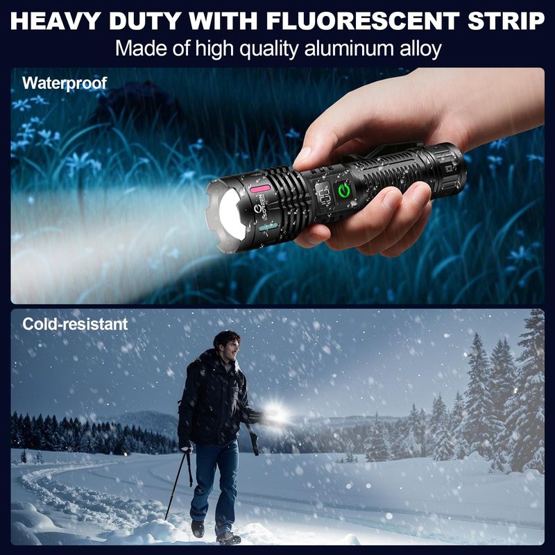 Pantalla digital LCD de larga duración de 10 horas y actualizada: la linterna de alta potencia Esgreen de haz largo está equipada con 1 batería recargable de 6000 mAh, por lo que puede proporcionar hasta 10 horas de brillo potente y no disminuyente. Tanto la batería como la linterna están incorporados en un chip inteligente que tiene la protección de sobrecarga para garantizar la seguridad. La pantalla de alimentación LCD muestra exactamente la energía restante, sabrá cuándo cargarla por adelantado.