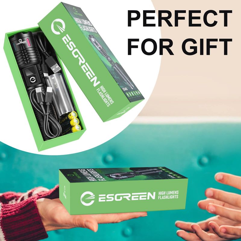 ESGREEN LINTERNAS RECARGABLES DE ALTO LúMENES 1000000 INDIVIDUALES 2 MODOS, LINTERNA LED SúPER BRILLANTE USB C LARGA DISTANCIA 3280 PIES, POTENTE DE LARGA DURACIóN 10H RESISTENTE LUZ DE FLASH FUERTE