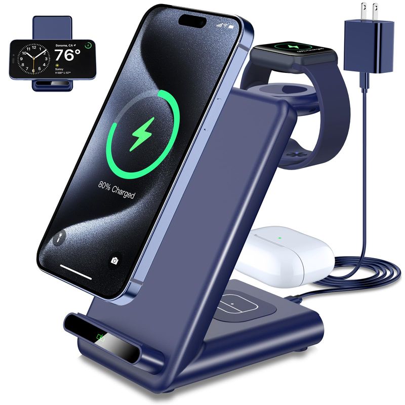 3 unidades de 1 unidad: esta estación de carga inalámbrica todo en uno con puntos dedicados hecha para tu iPhone, Apple Watch y AirPodsAirPods Pro, puedes cargar fácilmente todos tus accesorios diarios en una ubicación central. Di adiós a los cables enredados y disfruta de la carga inalámbrica simplemente colocando tu teléfono en el soporte de carga, no más problemas de enchufesalida.