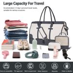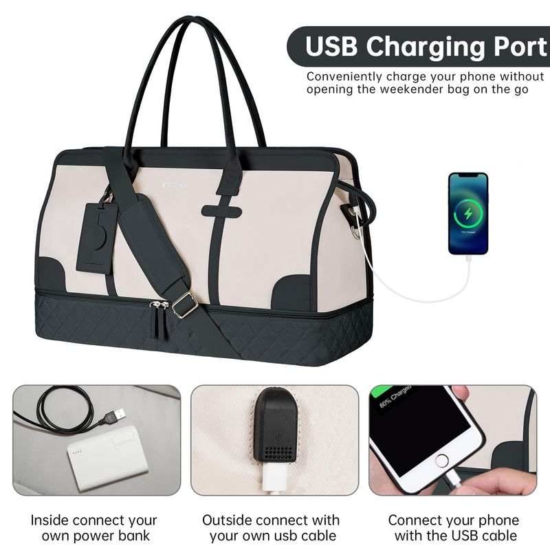 Bolsa de viaje grande para mujer: la bolsa de viaje cuenta con múltiples bolsillos y compartimentos para organizar cosas, espacio amplio que puede caber en artículos esenciales de viaje de 3 a 5 días, cabe fácilmente en tu ropa, artículos de tocador, zapatos, laptop y otros artículos. En la parte posterior de la bolsa de lona hay un bolsillo para acceder fácilmente a tu teléfono inteligente, identificación o pasaporte. Equipado con un puerto de carga USB integrado, perfecto para cargar tu teléfono u otros dispositivos mientras viajas.