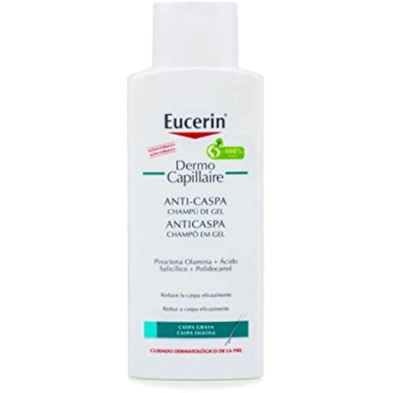 Eucerin El champú anticaspa Dermo Capillaire para la caspa grasa alivia la picazón limpiando suavemente el cabello y el cuero cabelludo.