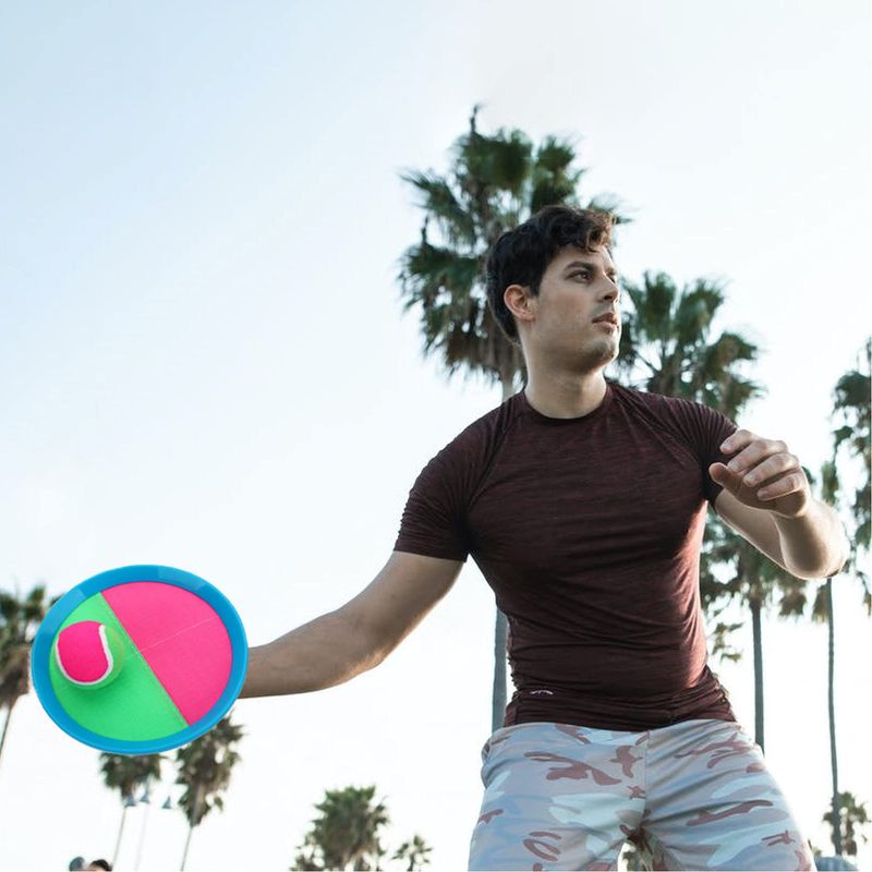 Mantiene a los niños activos, promueve la interacción: el juego de pelota puede ejercitar la coordinación ojo-mano y los músculos del brazo, es importante siempre mantener a los niños activos y felices. Mediante el uso de la estructura de tela adhesiva de nailon de alta calidad, las raquetas son increíblemente pegajosas, los niños pueden atrapar la pelota muy fácilmente, por lo cuál no sentirán frustración. El juego de lanzamiento necesita al menos 2 jugadores, gracias a eso, es una buena manera de promover la interacción entre amigos y miembros de la familia.
