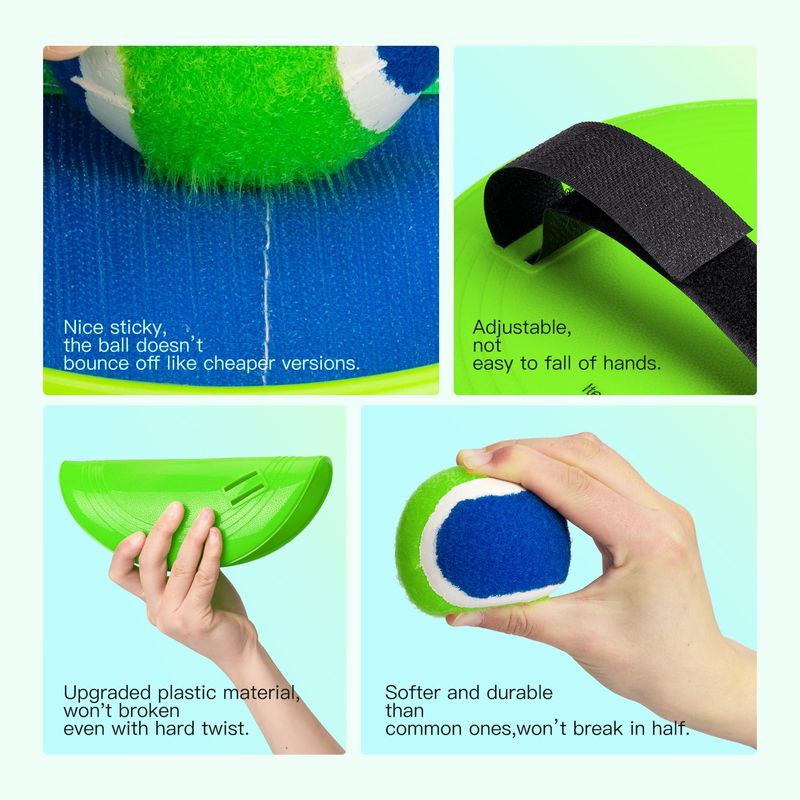 Mantiene a los niños activos, promueve la interacción: el juego de pelota puede ejercitar la coordinación ojo-mano y los músculos del brazo, es importante siempre mantener a los niños activos y felices. Mediante el uso de la estructura de tela adhesiva de nailon de alta calidad, las raquetas son increíblemente pegajosas, los niños pueden atrapar la pelota muy fácilmente, por lo cuál no sentirán frustración. El juego de lanzamiento necesita al menos 2 jugadores, gracias a eso, es una buena manera de promover la interacción entre amigos y miembros de la familia.