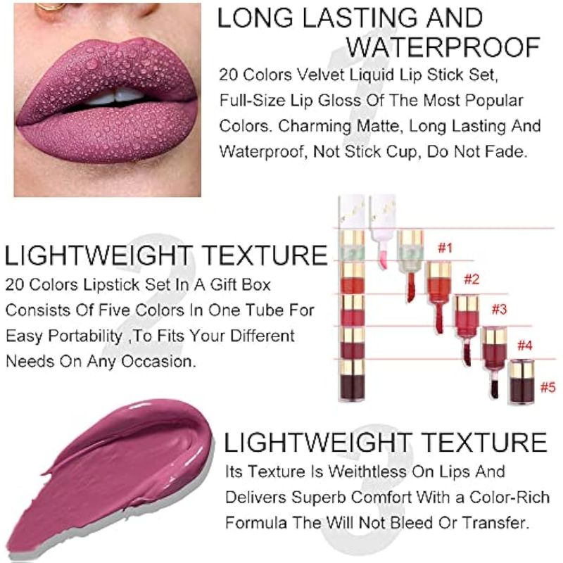 evpct Juego de 20 colores de lápiz labial líquido mate, paquetes de manchas de labios para mujeres