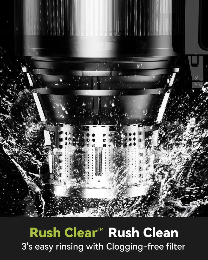 3-Second Rush Clear: el filtro exprimidor todo en uno que no se obstruye se puede limpiar en solo 3 segundos.