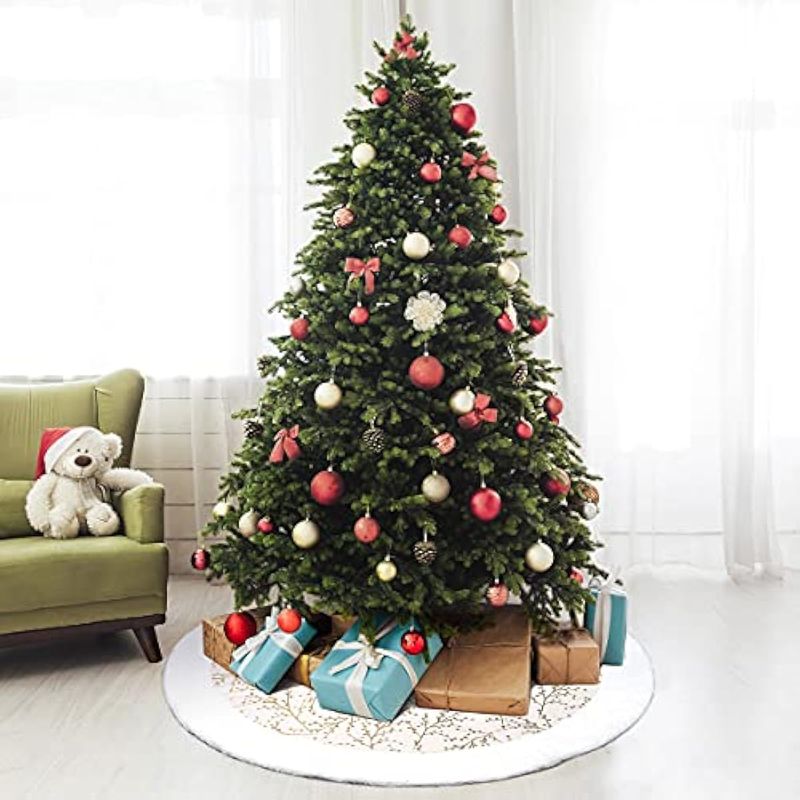 Diámetro: 48 pulgadas. Este tapete esponjoso para base de árbol tiene un tamaño ideal para una amplia gama de árboles de Navidad, y lo suficientemente grande como para ocultar el antiestético soporte de árbol. Puedes colocar regalos de Navidad y decoraciones en la falda del árbol para hacer que tu árbol de Navidad sea más encantador.