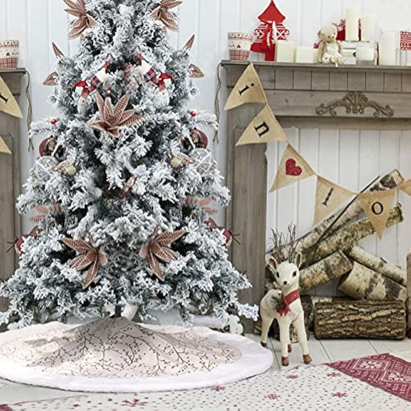 Diseño único y clásico: el brillante patrón de ramas de acebo dorado champán es diferente del patrón de copos de nieve blancos ordinarios, lo que hace que las faldas de árbol de Navidad sean únicas y hermosas. La textura blanca nevada y dorada de lujo hacen que tu árbol de Navidad sea más atractivo y excepcional.