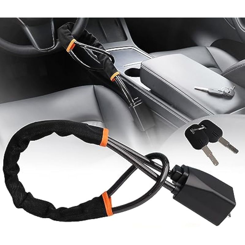 Universal para la mayoría de vehículos: el cable de acero del bloqueo del volante del automóvil es lo suficientemente largo como para ajustar para bloquear firmemente el volante y el enchufe del cinturón de seguridad del automóvil. Se adapta a la mayoría de vehículos en el mercado, por lo que no tienes que preocuparte por la compatibilidad. Viene con 2 llaves, puedes llevar una de las llaves para el uso diario mientras dejas otra en casa en caso de perder una accidentalmente.