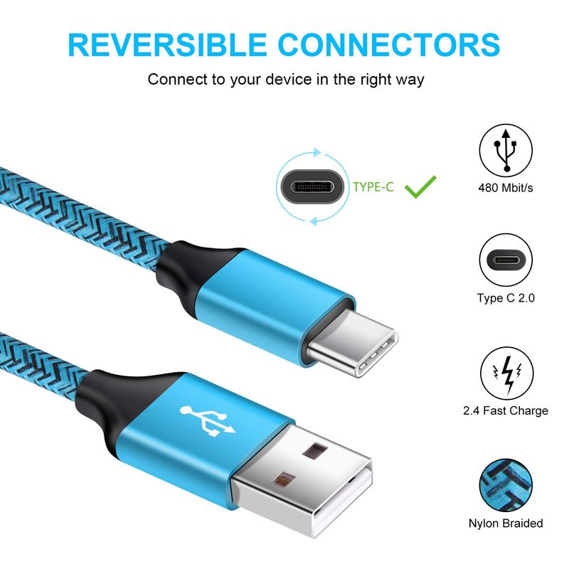 ??Fast Charge & Data Transfer?: Our USB Type C Cord support Qualcomm QC 2.0, allowing voltage is 5V, the maximum output current is 2.4Amp, and transfer speed up to 480Mbps. This Nylon Braided Charging Cable prevents to bending is tangle free and robust. It pasts 10000+ times bend test. It also contained 56K? resistor to protect your device from high current danger and ensure safe charging.