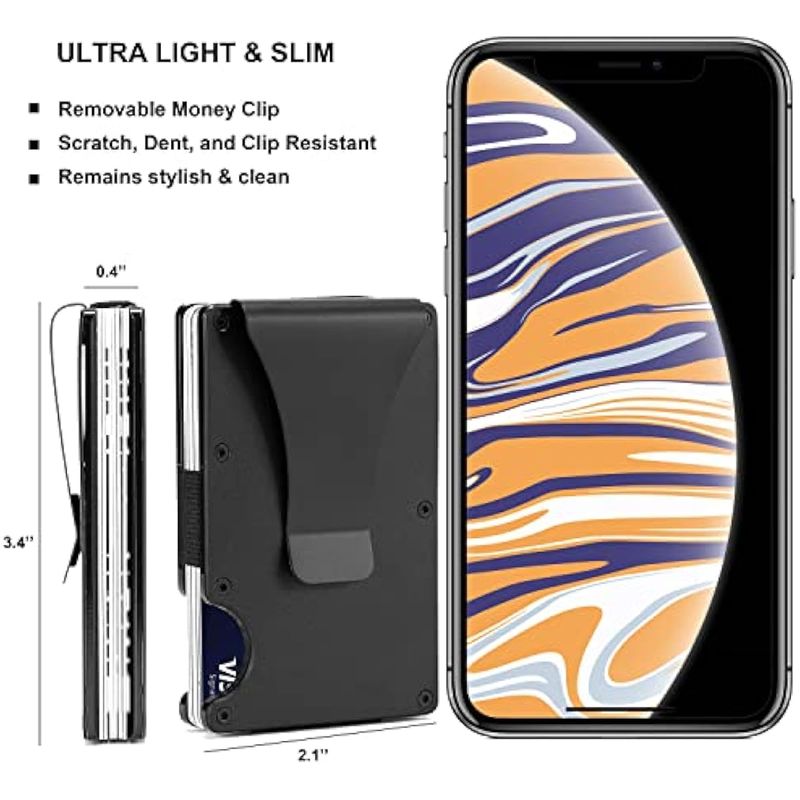 Cartera minimalista delgada de 0.91 x 1.42 x 0.43 pulgadas. El estuche puede contener de 1 a 12 tarjetas sin distorsión. El clip de dinero de acero inoxidable 304 se utiliza para guardar dinero en efectivo y facturas. La muesca exterior hace que sea fácil sacar las tarjetas. Ya no tendrás que preocuparte por tus bolsillos delanteros hinchados con esta cartera delgada para tarjetas.