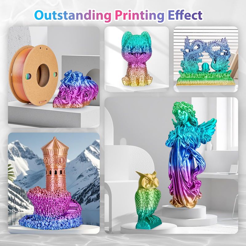 FILAMENTO QUE CAMBIA DE COLOR RÁPIDO: A diferencia de los filamentos de color normales o múltiples, el filamento PLA arcoíris es un filamento de gradiente que cambia de color alrededor de 10 a 39.4 ft y es excelente para impresiones más grandes para mostrar todos los colores. El filamento PLA de seda arcoíris cuenta con una textura sedosa única, lo que resulta en impresiones con superficies lisas y brillantes. El filamento PLA de seda es perfecto para artes, manualidades, bricolaje, principiantes y puedes obtener hermosos colores en un modelo de filamento PLA.