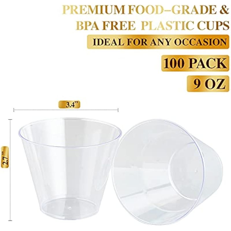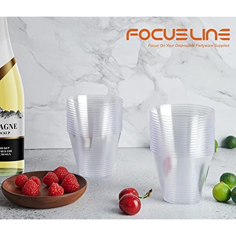FOCUSLINE Vasos de plástico transparente de 9 onzas, paquete de 100 vasos desechables de plástico