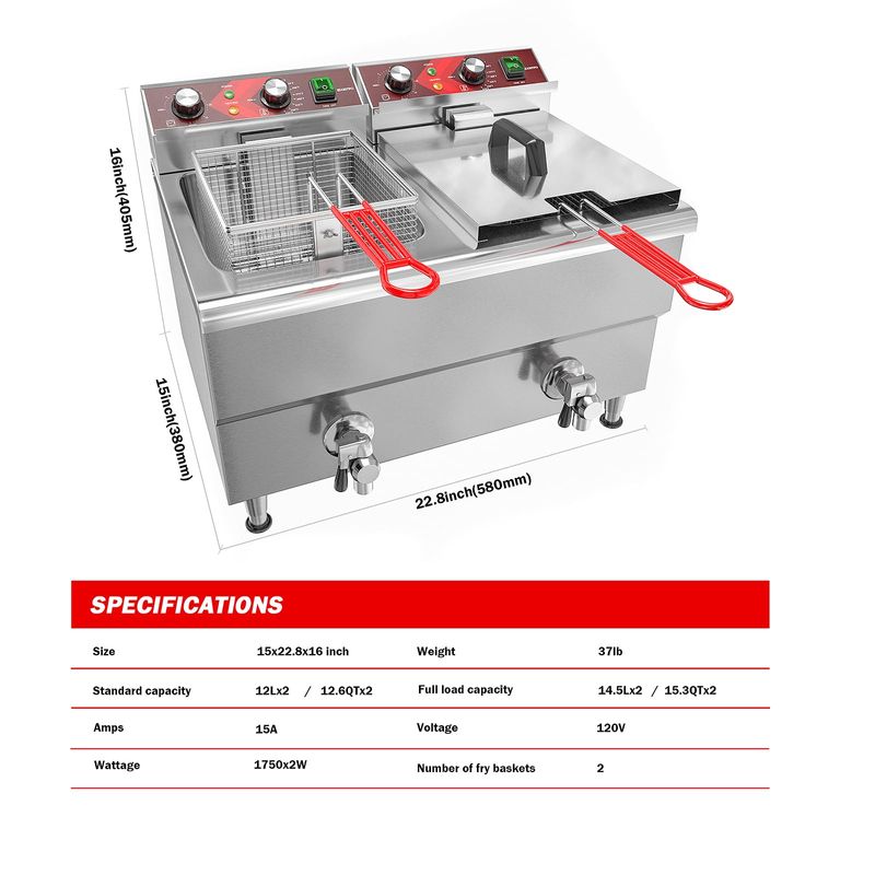 FREIDORA COMERCIAL DE ACERO INOXIDABLE FREIDORA ELéCTRICA CON FILTRACIóN DE ACEITE Y TEMPORIZADOR, 24L DE GRAN CAPACIDAD, DOBLE TANQUE CON CESTAS Y TAPAS, FREIDORA DE ENCIMERA PARA USO EN