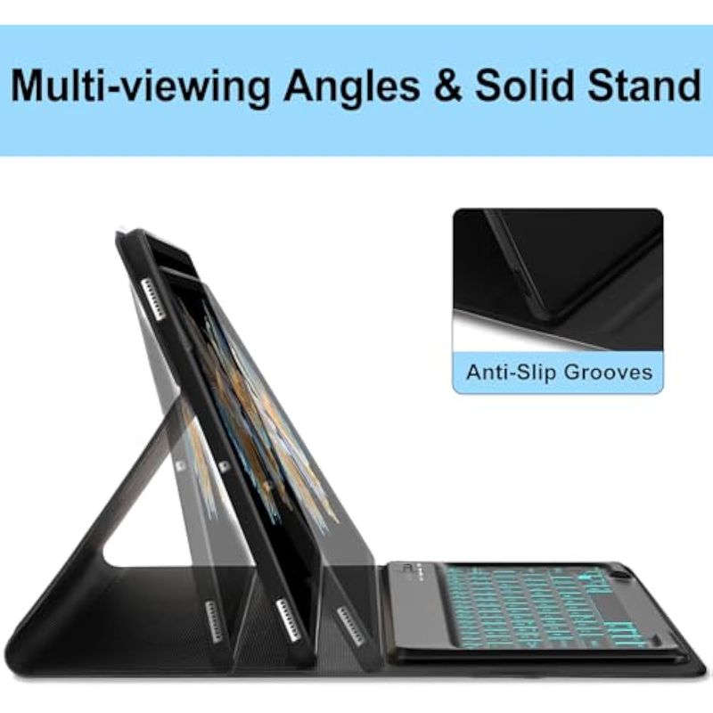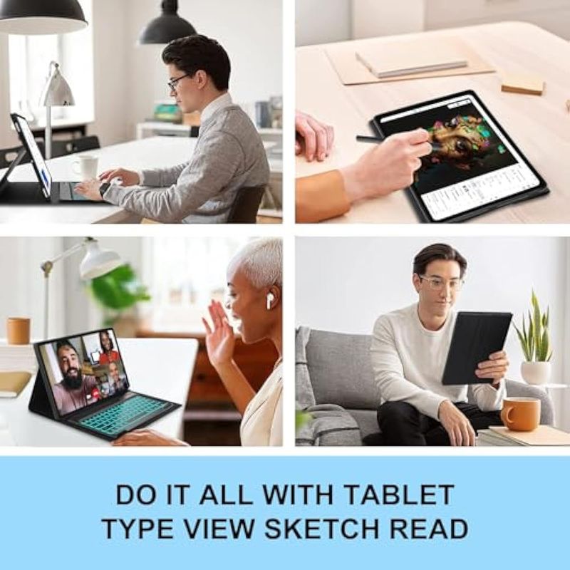 - Una cubierta protectora y un teclado real y silencioso admite 3 modos de uso - Escribir, ver, leer - lo que le da una versatilidad increíble. Le permite apuntalar la tableta para ver videos.