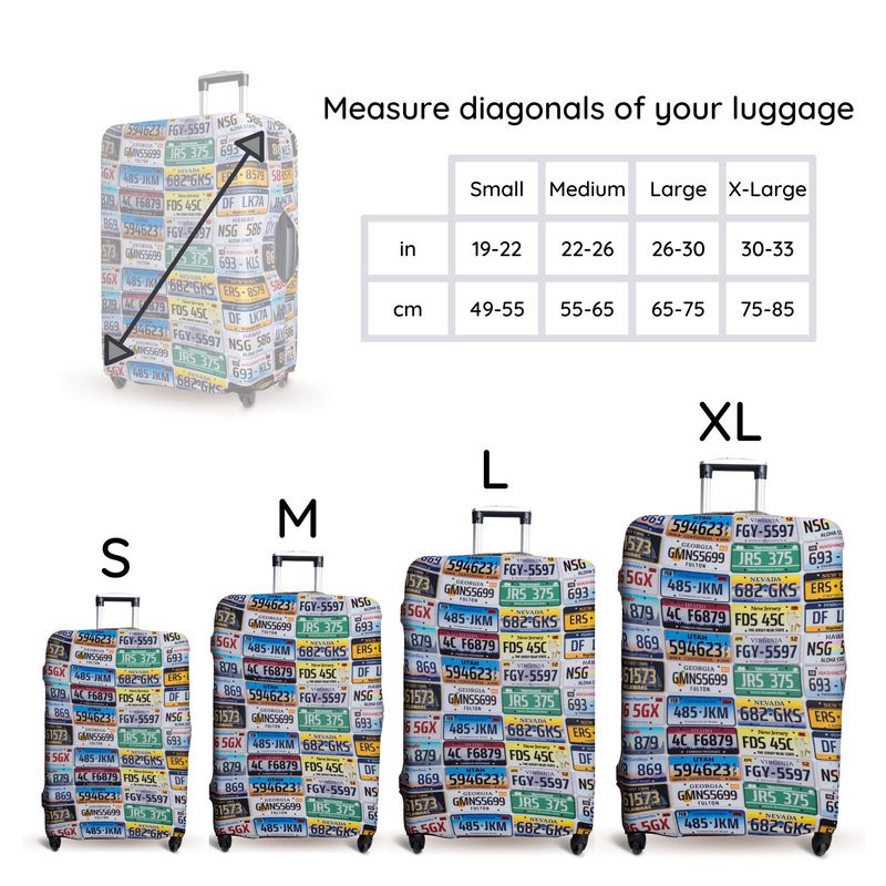 4 tamaños disponibles para adaptarse a casi cualquier equipaje. S: para equipaje de 19 a 22 pulgadas, M: para equipaje de 22 a 26 pulgadas, L: para equipaje de 26 a 30 pulgadas, XL: para equipaje de 30 a 33 pulgadas.