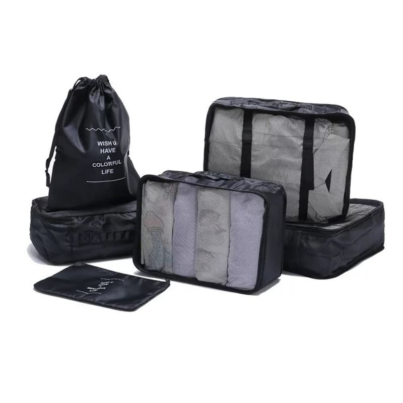 6 bolsas de diferentes tamaños: 3 cubos de embalaje de malla: L: 15.8"x12.2"x4.3", M: 12.2"x11"x4.3", S: 12.2"x7.9"x4.3"; 1 bolsa de ropa interior: 11" x 7.9" x 4.3"; 1 bolsa con cordón: 13.8" x 10.6" "; 1 Piso Bolsa: 10.2 x 5.9 pulgadas. Se cosen manualmente, hay tamaños que habrá algún error, el error que controlamos en el ± 0.8 in.
