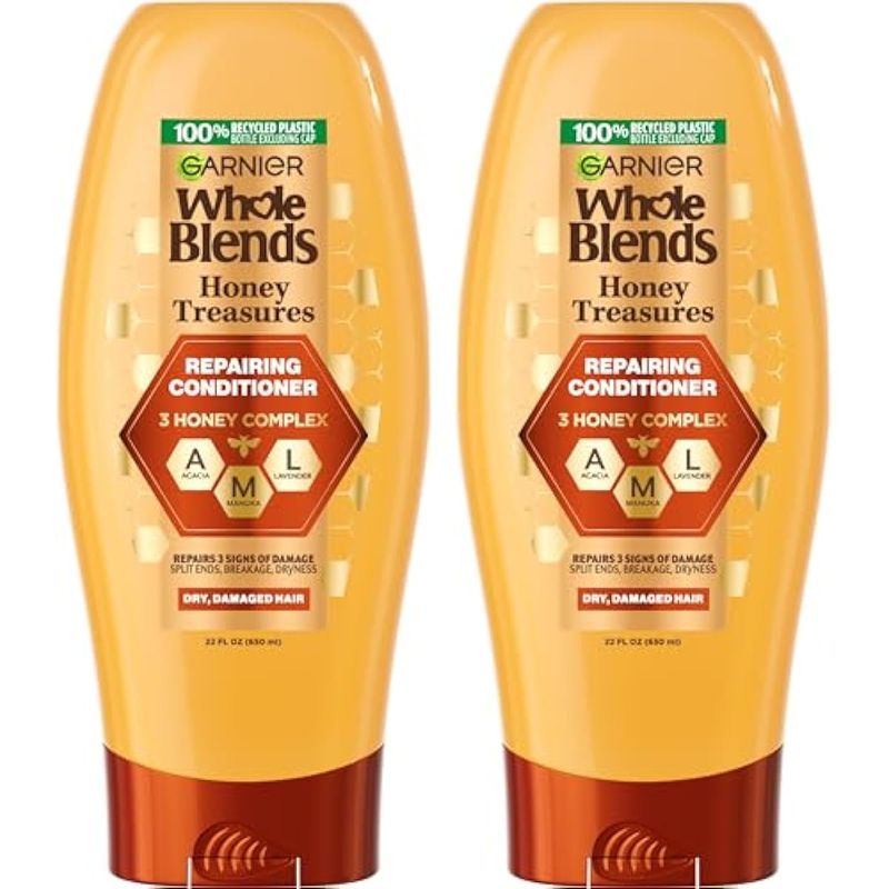 Garnier Sistema de reparación de mezclas enteras: Para obtener los mejores resultados de fortalecimiento y reparación del cabello, utilice el sistema completo Whole Blends Honey Treasures System, con champú, acondicionador, mascarilla para el cabello y tratamiento capilar 10 en 1