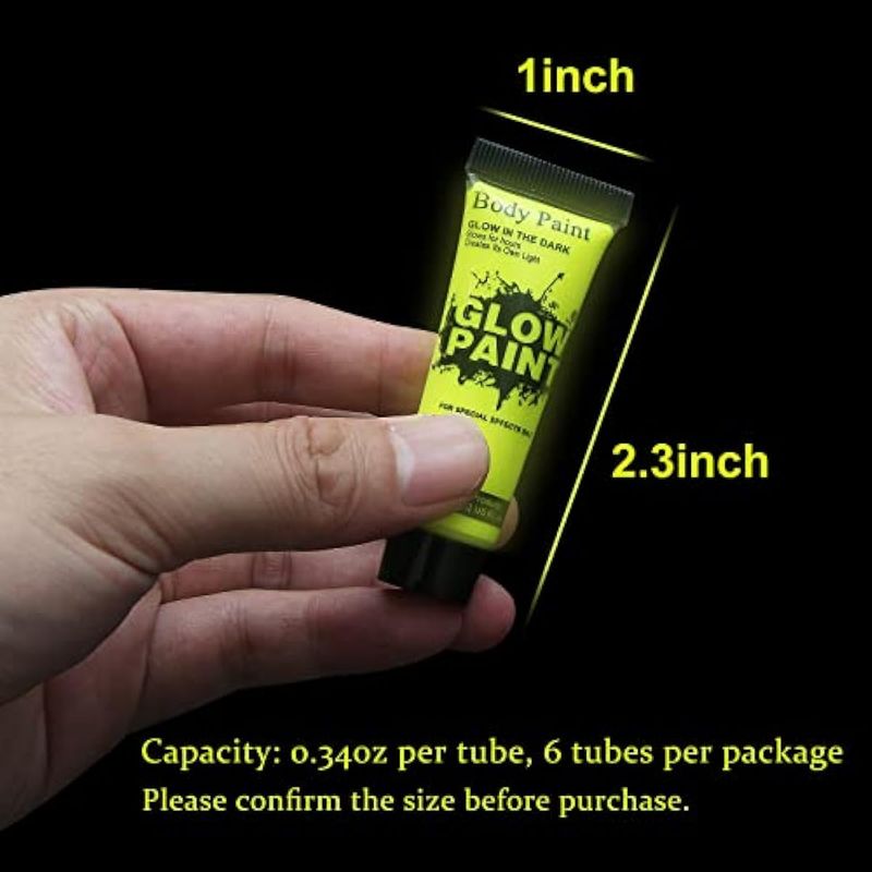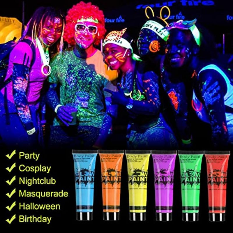 GARYOB - PINTURA PARA ROSTRO Y CUERPO QUE BRILLA EN LA OSCURIDAD, LUZ UV Y NEóN, FLUORESCENTE, 0.34 ONZAS, JUEGO DE 6 TUBOS
