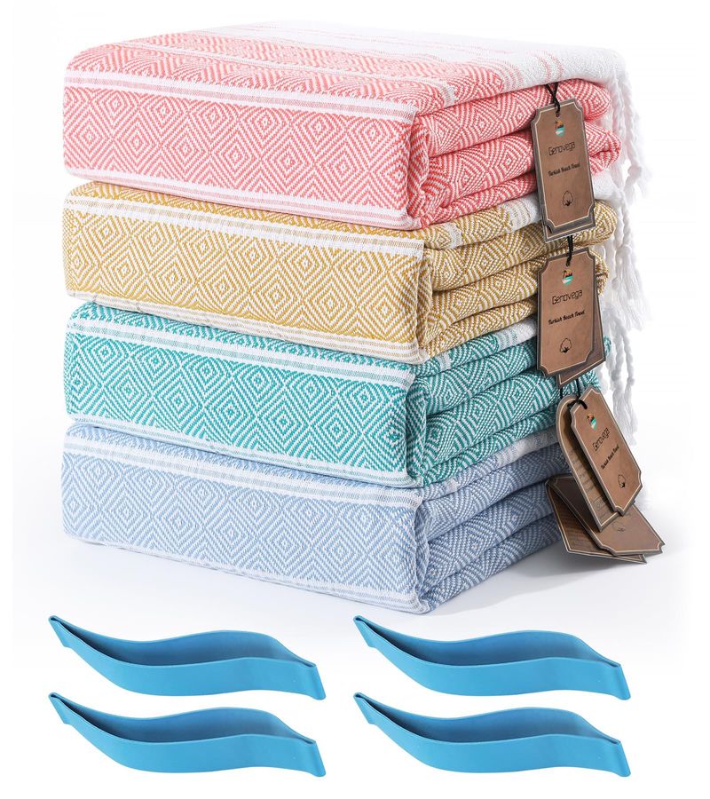 GENOVEGA JUEGO DE 4 TOALLAS DE PLAYA TURCAS DE ALGODóN, EXTRA GRANDES, DE SECADO RáPIDO, SIN ARENA, PARA BAñO, PISCINA, NATACIóN, PARA ADULTOS, ARTíCULOS ESENCIALES DE VIAJE, ACCESORIOS DE CRUCERO, PAQUETE MúLTIPLE
