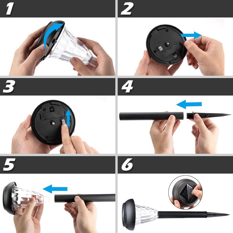 Instalación rápida y fácil: no requiere herramientas, solo sigue algunas instrucciones sencillas. Configuración y operación inalámbricas. Simplemente enciende tus luces solares para exteriores con un simple interruptor y empuja las luces solares para exteriores en el suelo con una estaca resistente. Vea los pasos simples a continuación.