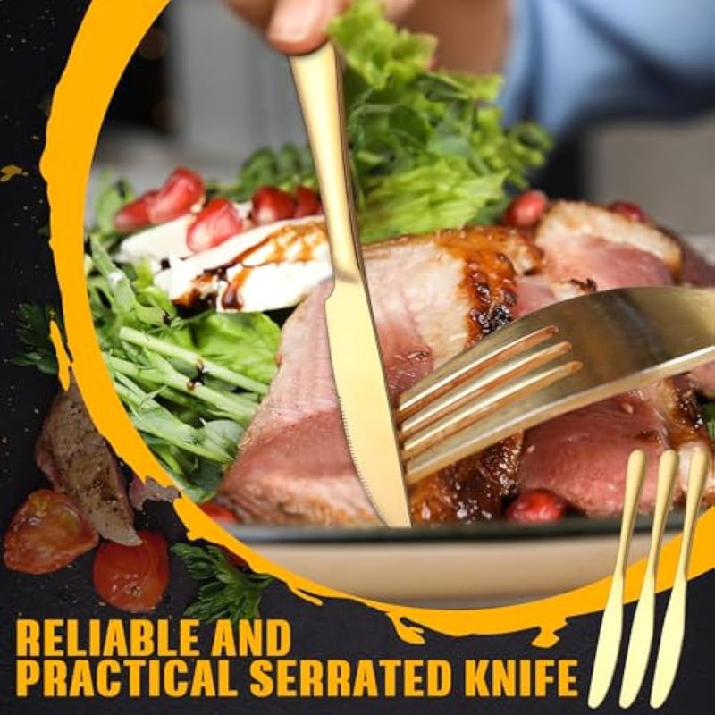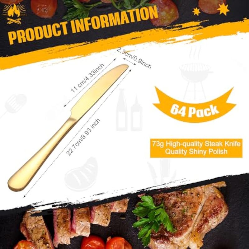 Gisafai Juego de 64 cuchillos dorados de carne de 9 pulgadas, cuchillo dentado dorado de acero