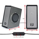 Especificaciones tecnológicas: garantía del fabricante de 3 años | 7 W RMS 3.5 W x 2; 14 W pico | Longitud del cable USBAUX: 5 pies | Entrada de audio: 0.138 in | Respuesta de frecuencia: 120 Hz – 20 KHz | Dimensiones cada uno: 5.8 x 4.4 x 2.7 pulgadas