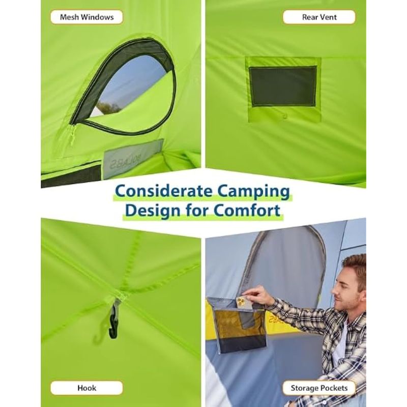 Comodidad en cualquier lugar: esta tienda de campaña incluye características pensadas como bolsillos interiores de almacenamiento para mantener los objetos pequeños organizados y un gancho en la parte superior para colgar luces, creando un espacio brillante y funcional. Su diseño versátil también permite la configuración del suelo, dándote la libertad de personalizar tu experiencia de campamento.