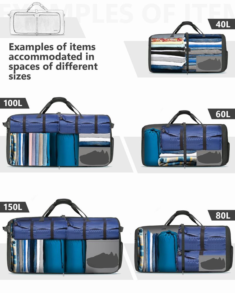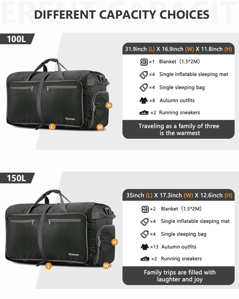 Gonex Bolsa de viaje plegable grande de 40 L, 60 L, 80 L, 100 L, 150 L, con compartimento para