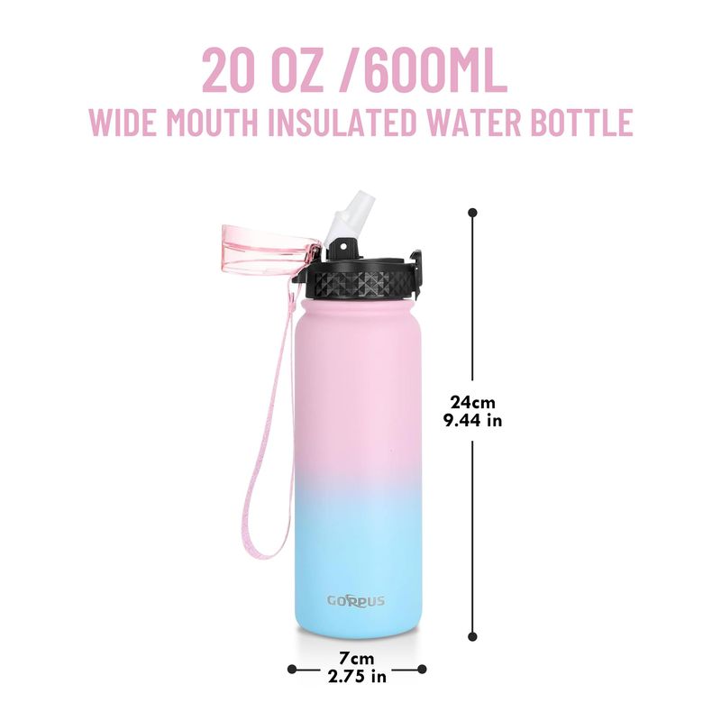 GOPPUS Botella de agua de acero inoxidable aislada de 20 onzas con tapa con pajilla, reutilizable, a