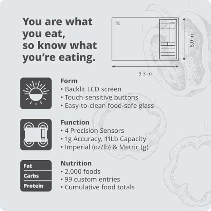Greater Goods Nourish Báscula de cocina, digital, con retroiluminación, muestra los datos