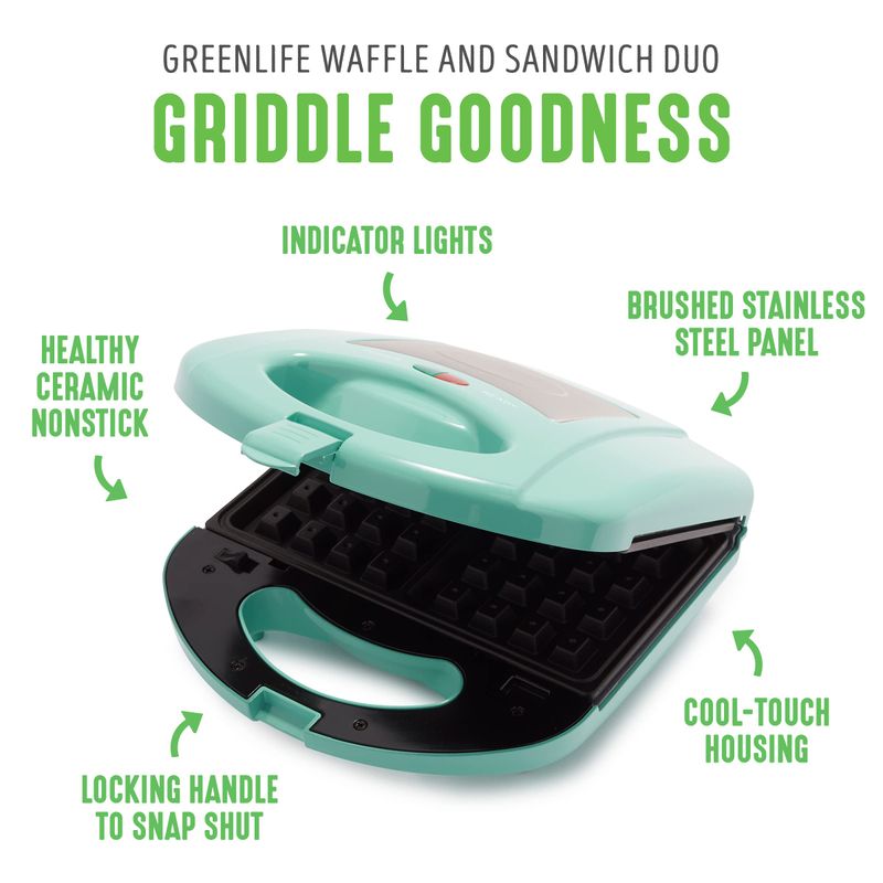 GREENLIFE PRO ELECTRIC PANINI PRESS GRILL AND SANDWICHERO, SáNDWICH DE DESAYUNO Y GOFRES DE TOSTADAS FRANCESAS, PLATOS ANTIADHERENTES DE CERáMICA SALUDABLES, LUZ INDICADORA FáCIL, SIN PFAS, TURQUESA