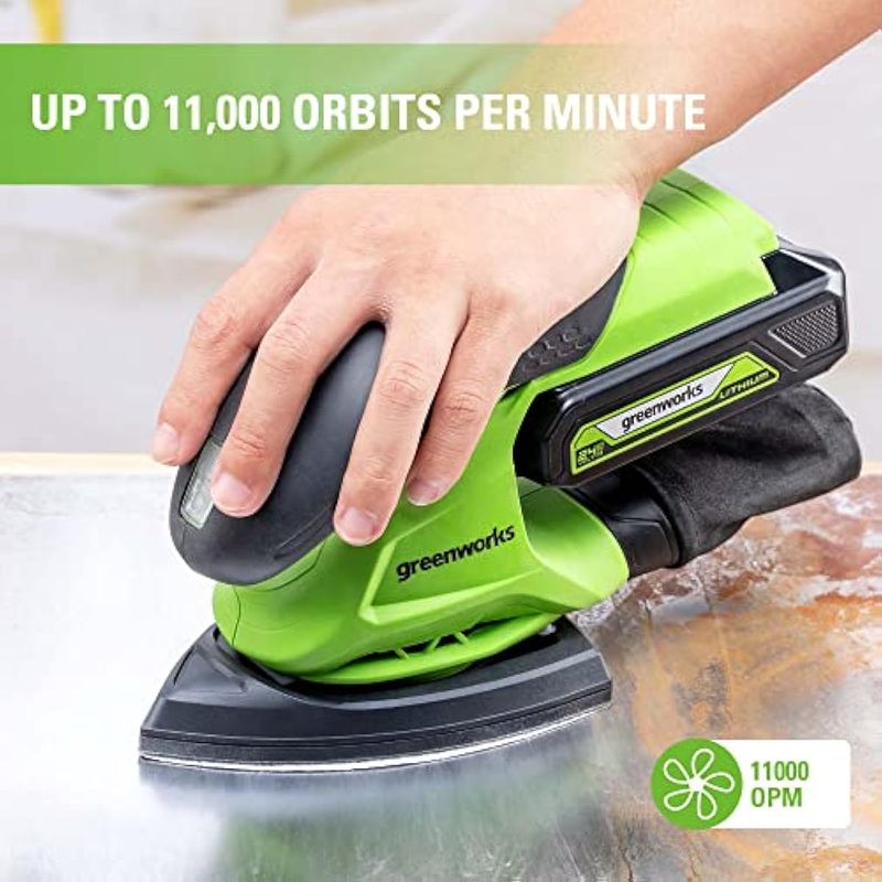 GREENWORKS LIJADORA DE DETALLES INALáMBRICA DE 24 V, LIJADORA DE ACABADO A BATERíA CON 2 PAPELES DE LIJA Y BOLSA DE RECOLECCIóN DE POLVO, COMPACTA Y LIGERA, CON BATERíA DE 2 AH Y CARGADOR