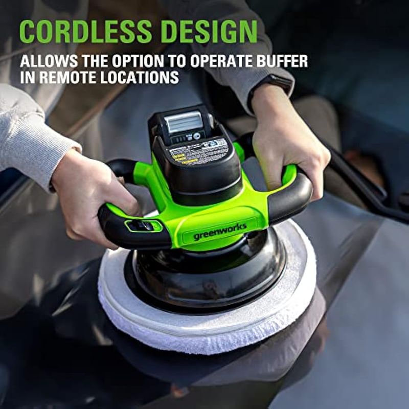 GREENWORKS POTENTE BúFER ORBITAL INALáMBRICO DE 24 V, ALMOHADILLA DE 10 PULGADAS, MáQUINA DE ENCERADO DE 2800 RPM CON 4 BONETES DE PULIDO, BATERíA DE 2.0 AH Y CARGADOR DE 2 A INCLUIDO