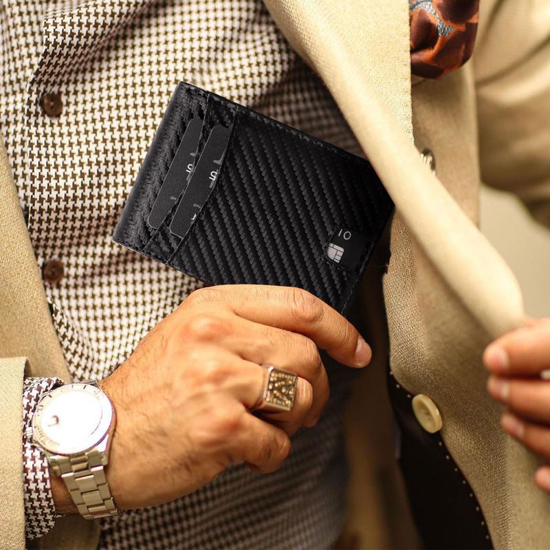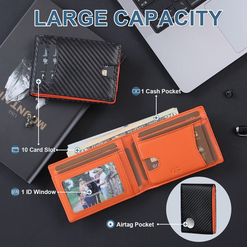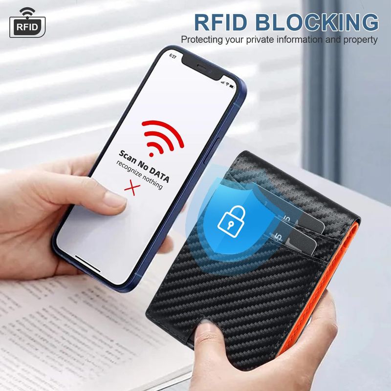Privacidad y seguridad: después de las pruebas, nuestra cartera para tarjetas para hombre puede proteger tus tarjetas de los potentes lectores de chips RFID. Y la ranura de la cartera sigilosa cuidadosamente diseñada es buena para proteger tu información de privacidad.