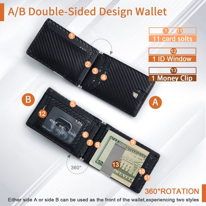 Minimalista y práctica: la cartera delgada tiene 0.4 pulgadas de grosor, tamaño de 4.3 x 3 pulgadas con clip para dinero tiene 11 ranuras para tarjetas y una ventana de identificación. Es ideal para llevar tarjetas de visita, tarjetas de crédito y débito, facturas, etc. La muesca exterior te permite empujar las tarjetas fácilmente.
