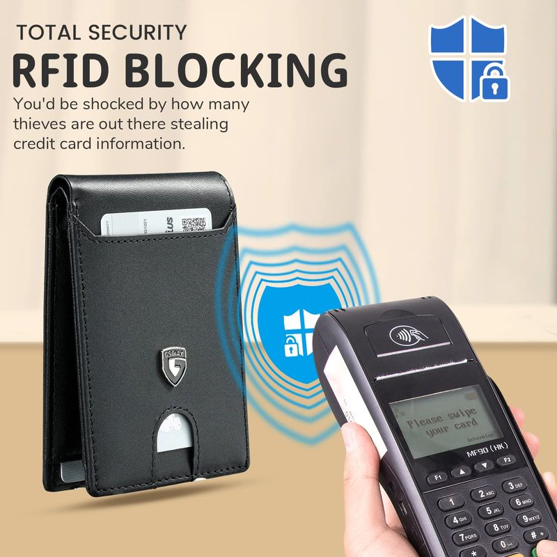 Protección de bloqueo RFID: la cartera delgada GSOIAX para hombre está equipada con tecnología avanzada de seguridad RFID, el forro de la cartera está hecho de un material compuesto de metal único diseñado específicamente para bloquear señales RFID a 13.56 MHz o más, protegiendo la valiosa información almacenada en el chip RFID de escaneos no autorizados.