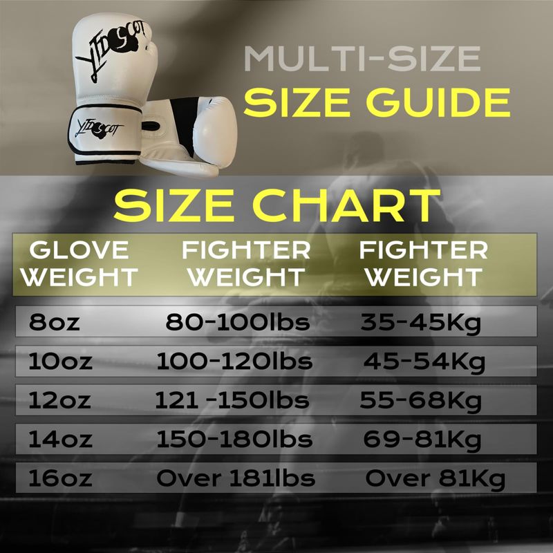 Varios tamaños: nuestros guantes de boxeo de entrenamiento están disponibles en tamaños de 8 oz, 10 oz, 12 oz, 14 oz y 16 oz