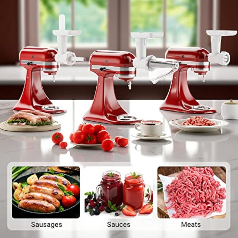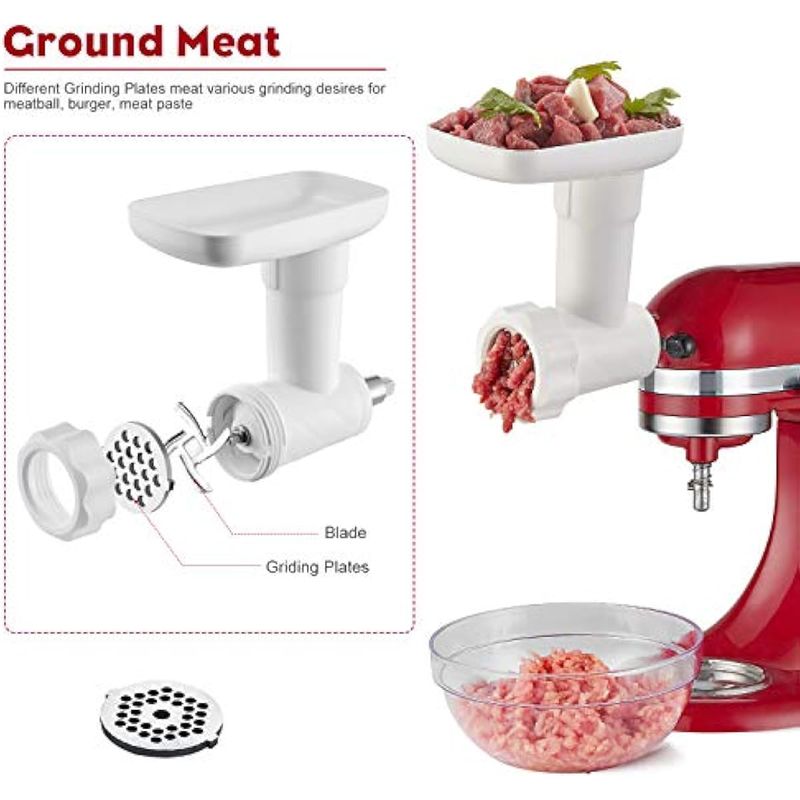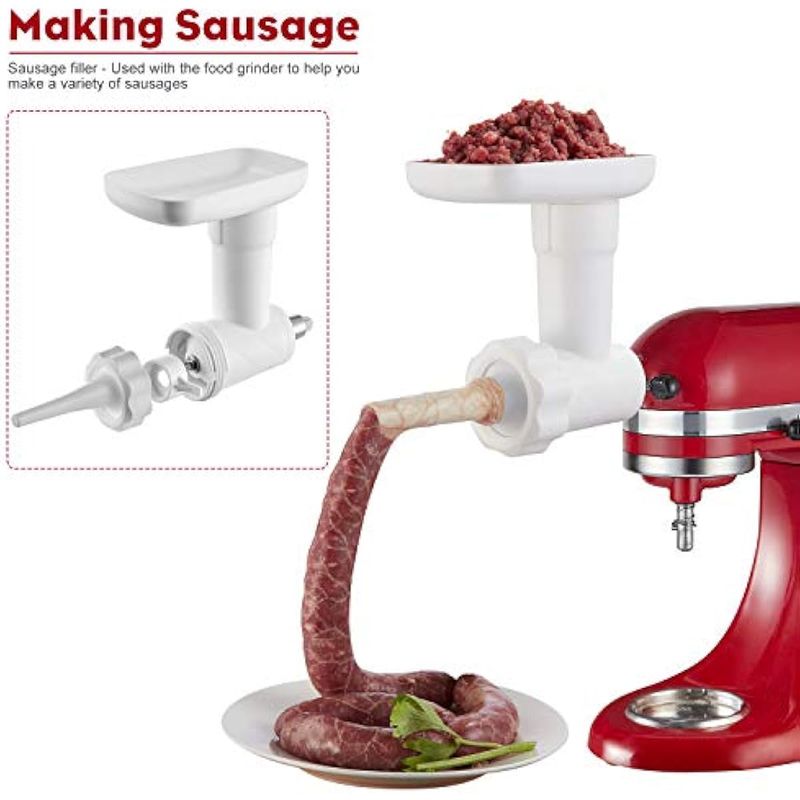 Accesorio para picadora de carne para batidora de pie KitchenAid: Los accesorios de mezclador de cocina duraderos y excelentes incluyen 2 cuchillas de molienda, 2 placas de molienda, 2 tubos de relleno de salchichas, 1 anillo de retención. Las placas de molienda y las cuchillas de molienda se pueden usar juntas para manejar una gran cantidad de alimentos fácilmente, como carne cruda, cocida, etc. El anillo retenedor mantiene los tubos de relleno de salchichas en su lugar para hacer dos tamaños diferentes de salchichas.