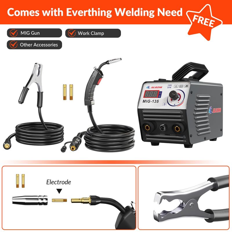 Accesorios de alta calidad: todos nuestros accesorios están hechos de materiales de alta calidad. El paquete incluye: 1 pistola MIG de 10 pies preinstalada, 1 soporte de electrodo de 500 A de 10 pies, 1 abrazadera de trabajo de 500 A de 10 pies, etc.