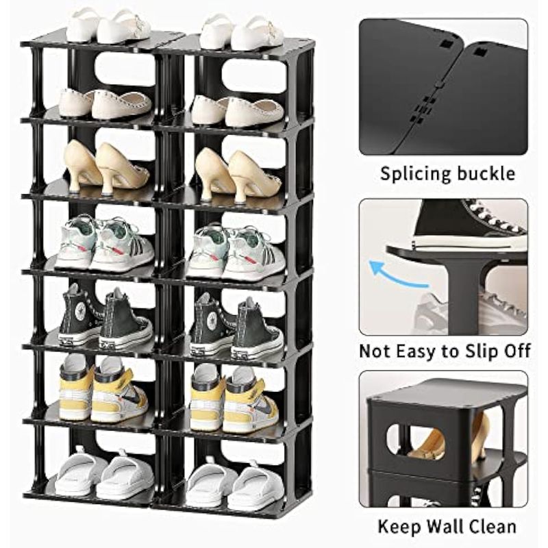 ?Combinación gratuita?El organizador de zapatos incluye conectores. Permite combinar dos estantes de zapatos juntos uno al lado del otro. Este organizador de zapatos de pie puede maximizar el espacio de almacenamiento vertical en el mismo espacio o unido horizontalmente para expandir la unidad. El diseño compacto mantiene eficazmente tus cosas de una manera organizada y proporciona un hogar acogedor y ordenado.